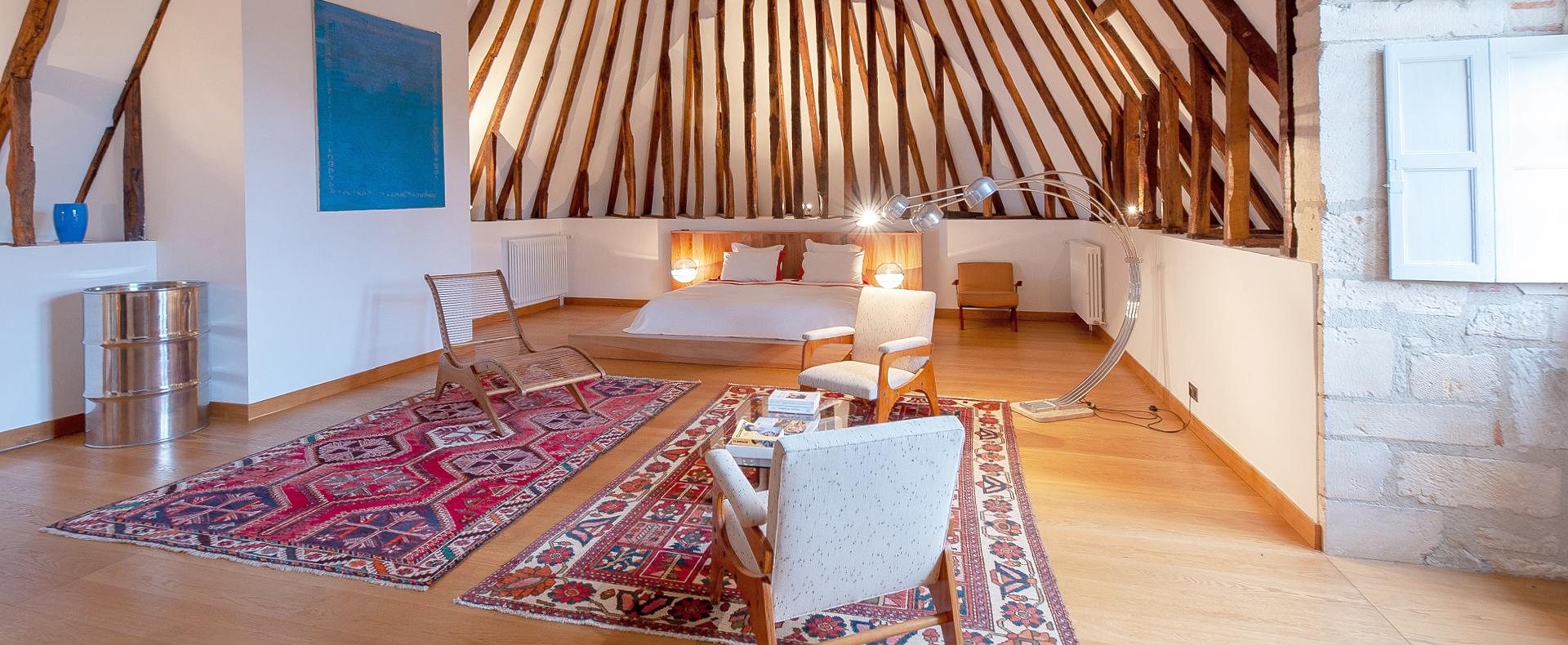 Named to honor its high ceiling and the surprising aspect of its period framework, this room has been decorated with Design furniture from the 50s and 60s as well as Contemporary Art. It offers superb views of the Garonne and the village.